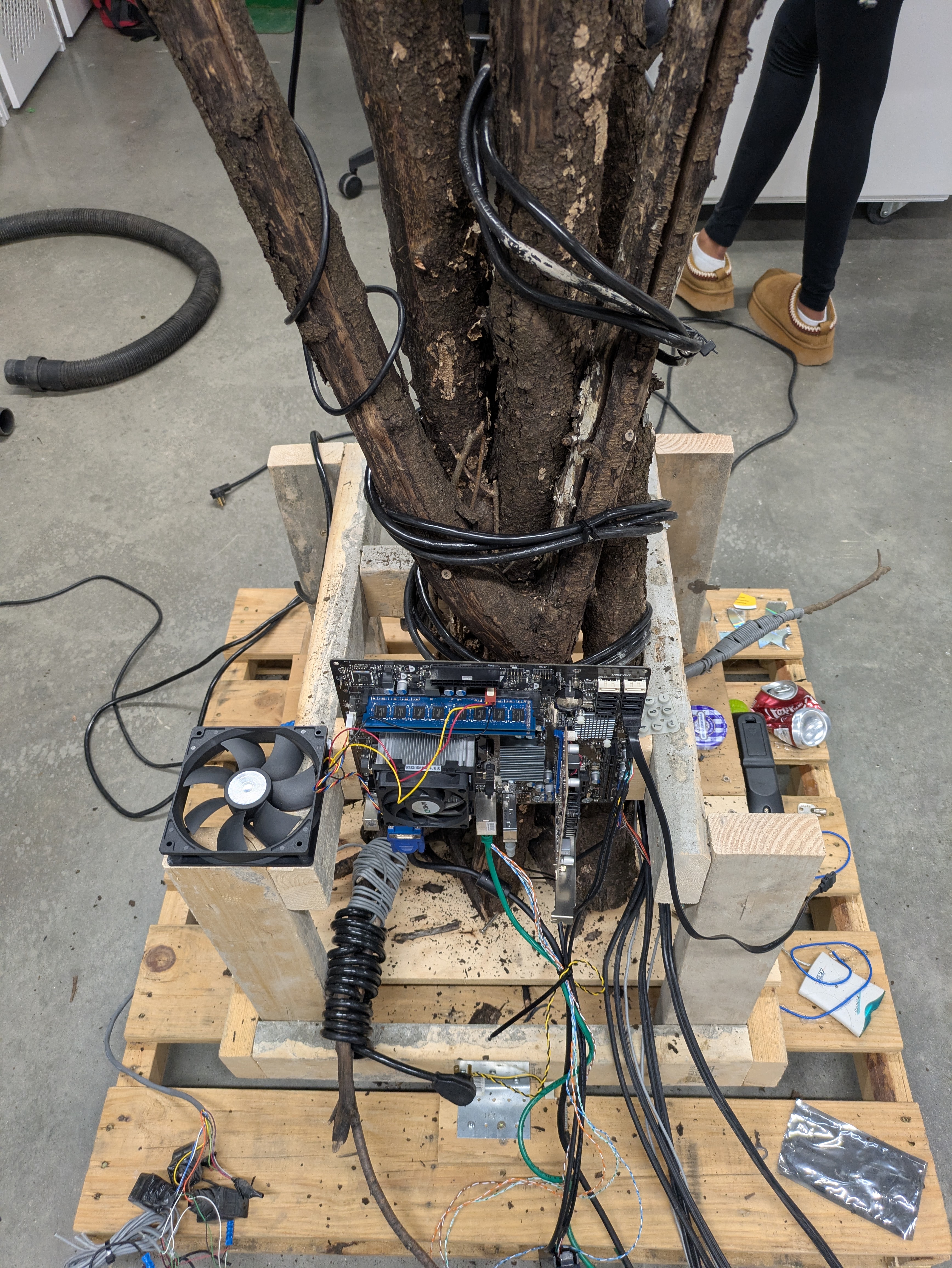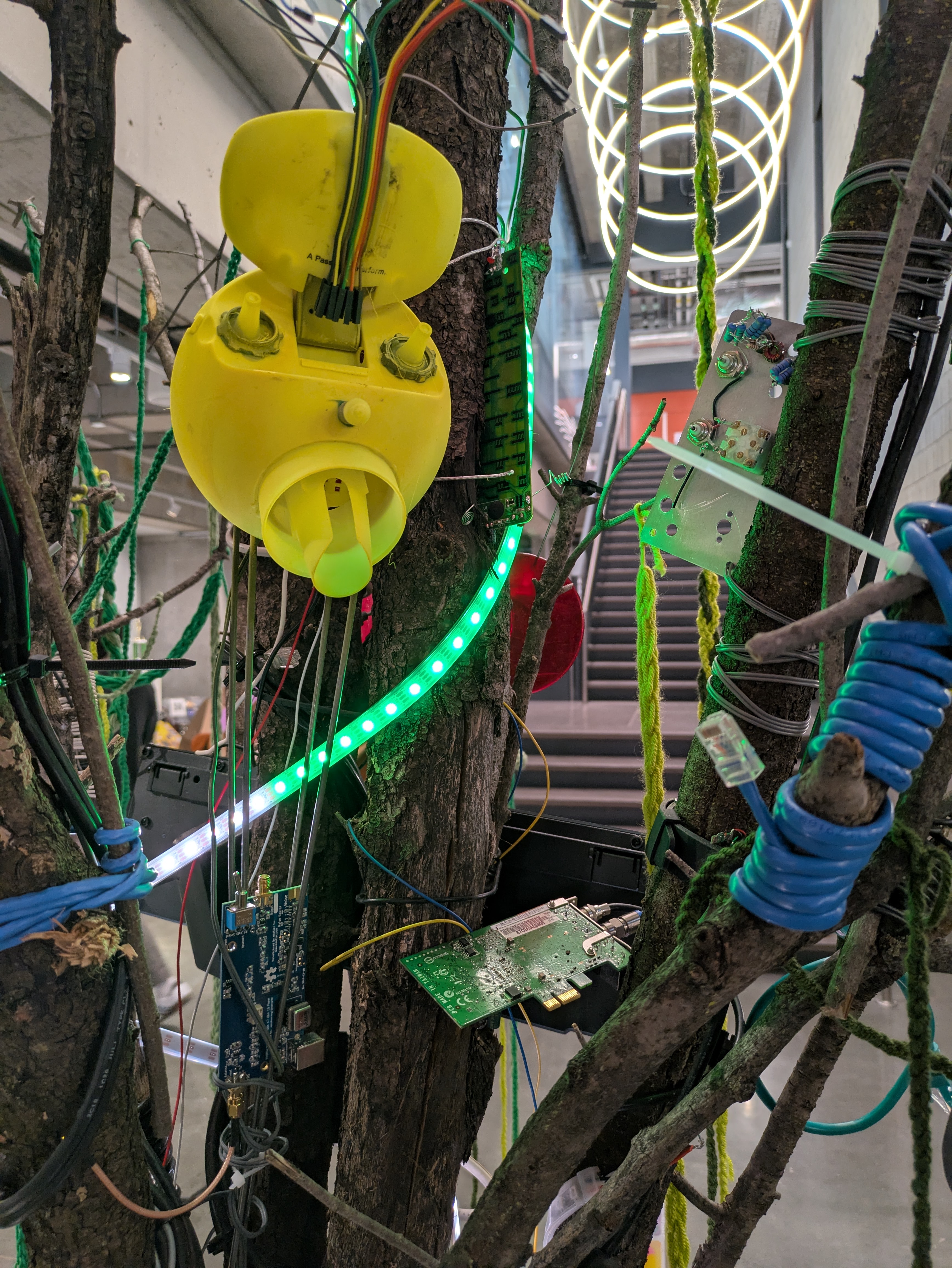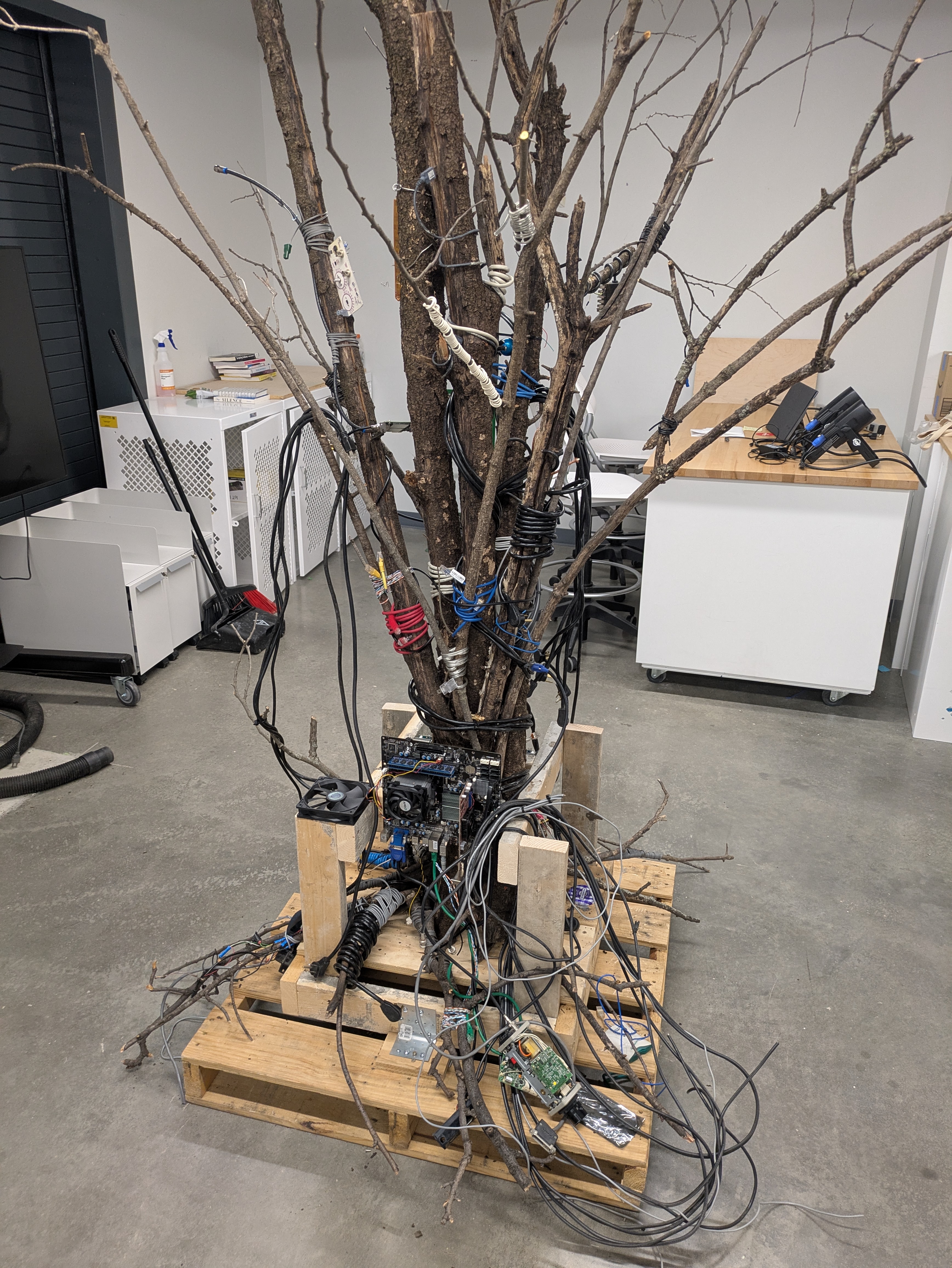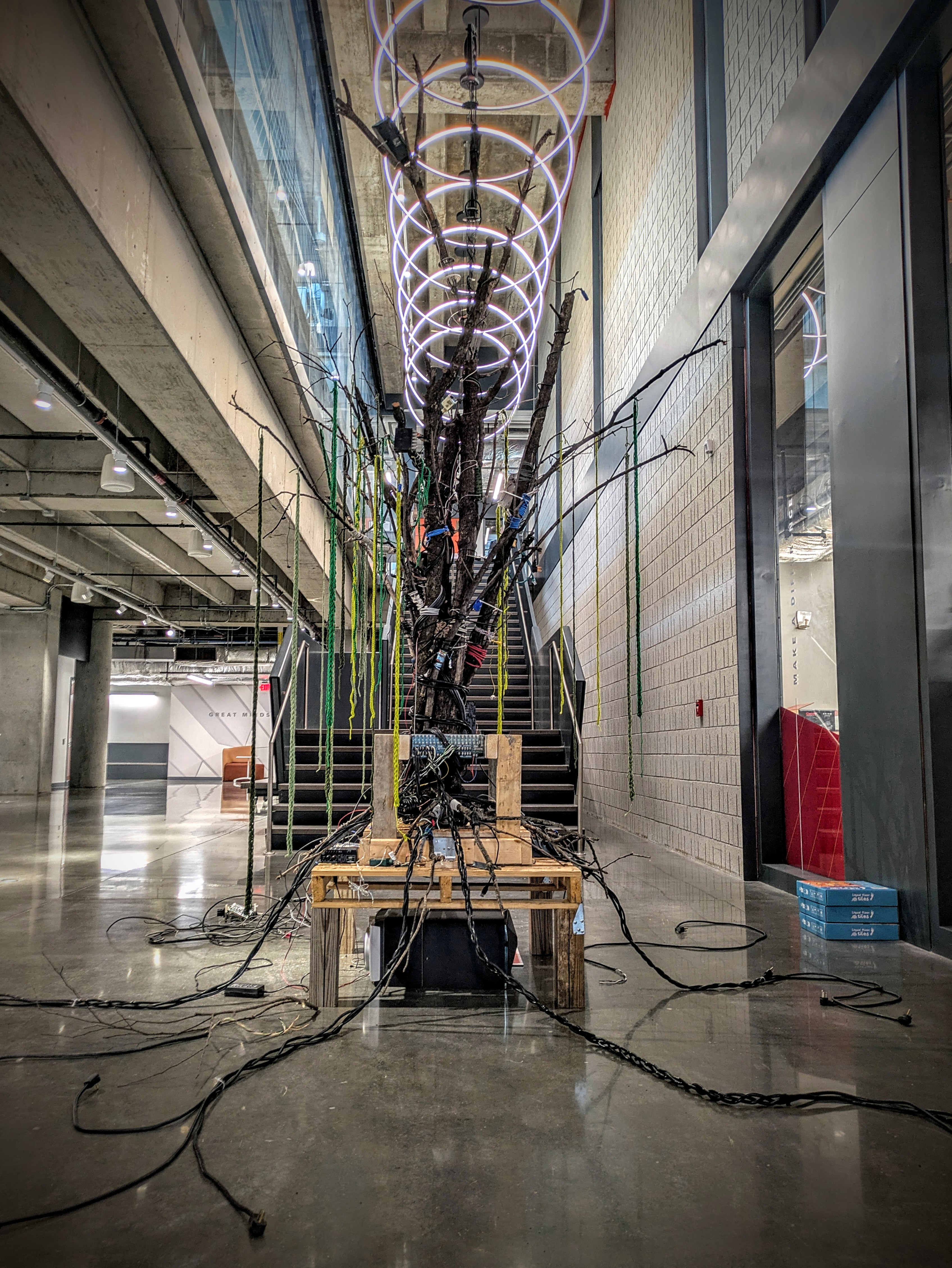 The entire structure was fabricated from recycled and found materials, using a dead tree as the primary framework. Technology included Raspberry Pi, a dedicated mini PC, custom sensor circuits, addressable LED strips, and a real-time audiovisual pipeline built with Processing, MIDI, and Strudel.js. Generative AI tools were used during early concept ideation and visual iteration.
