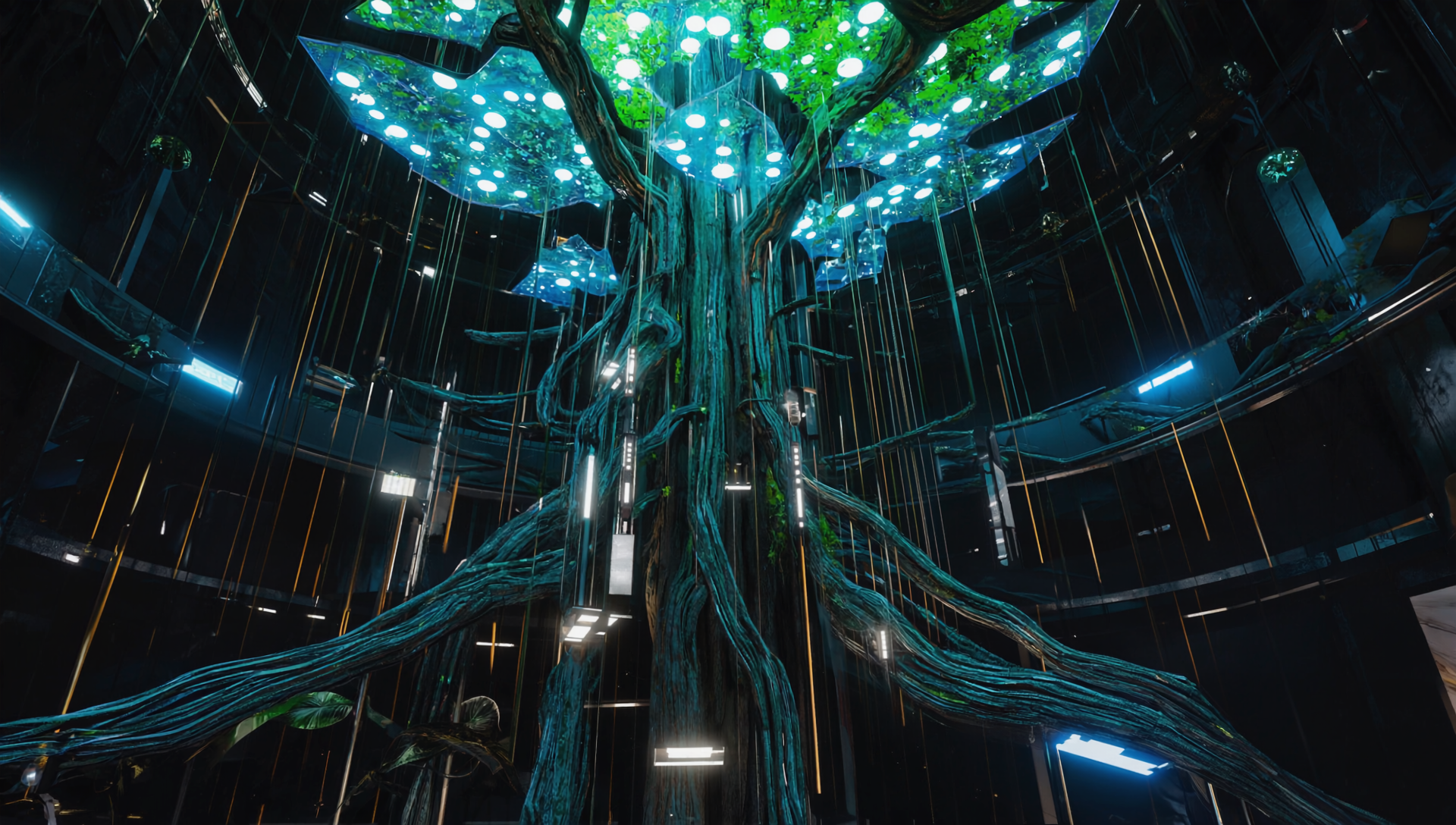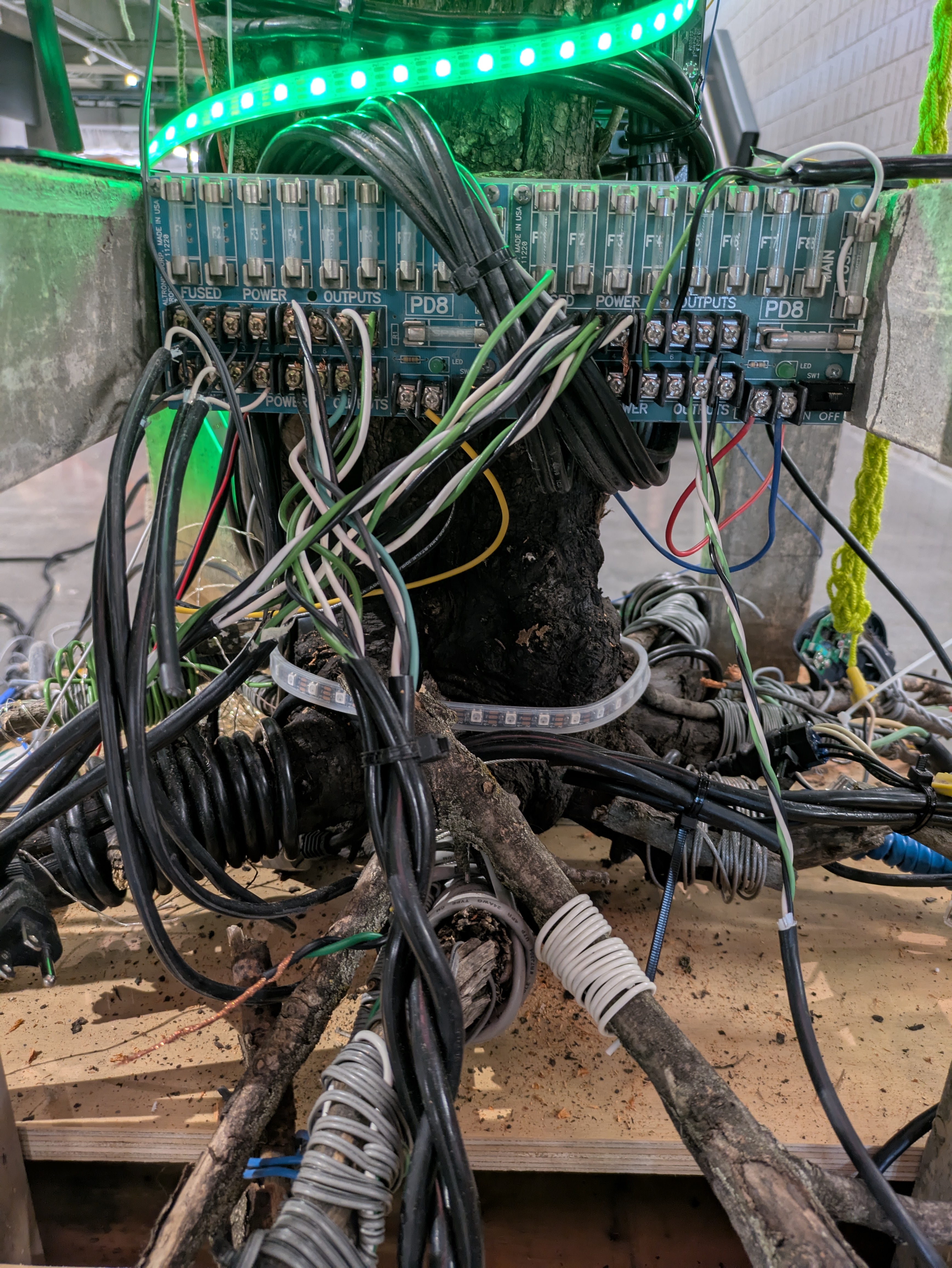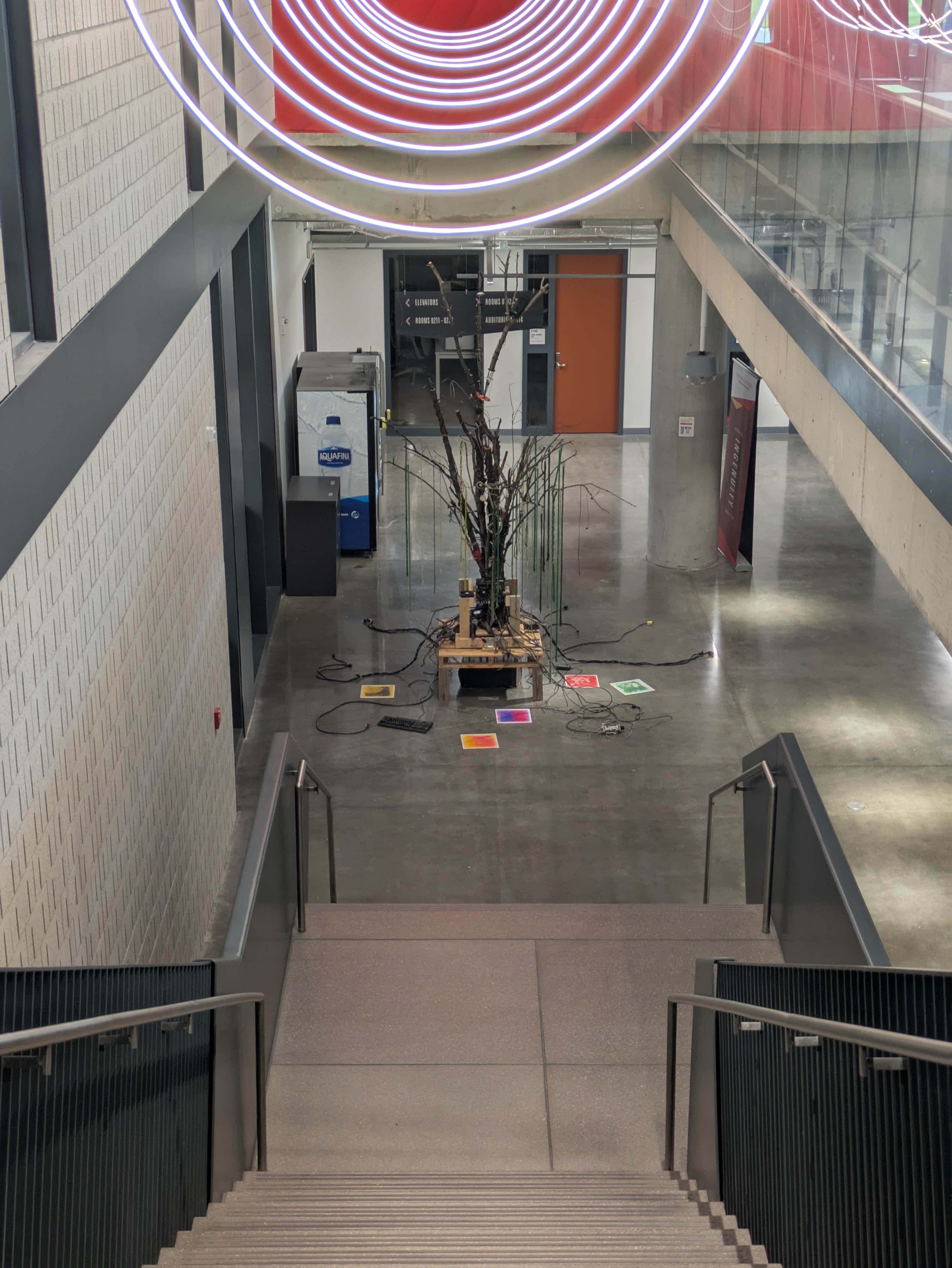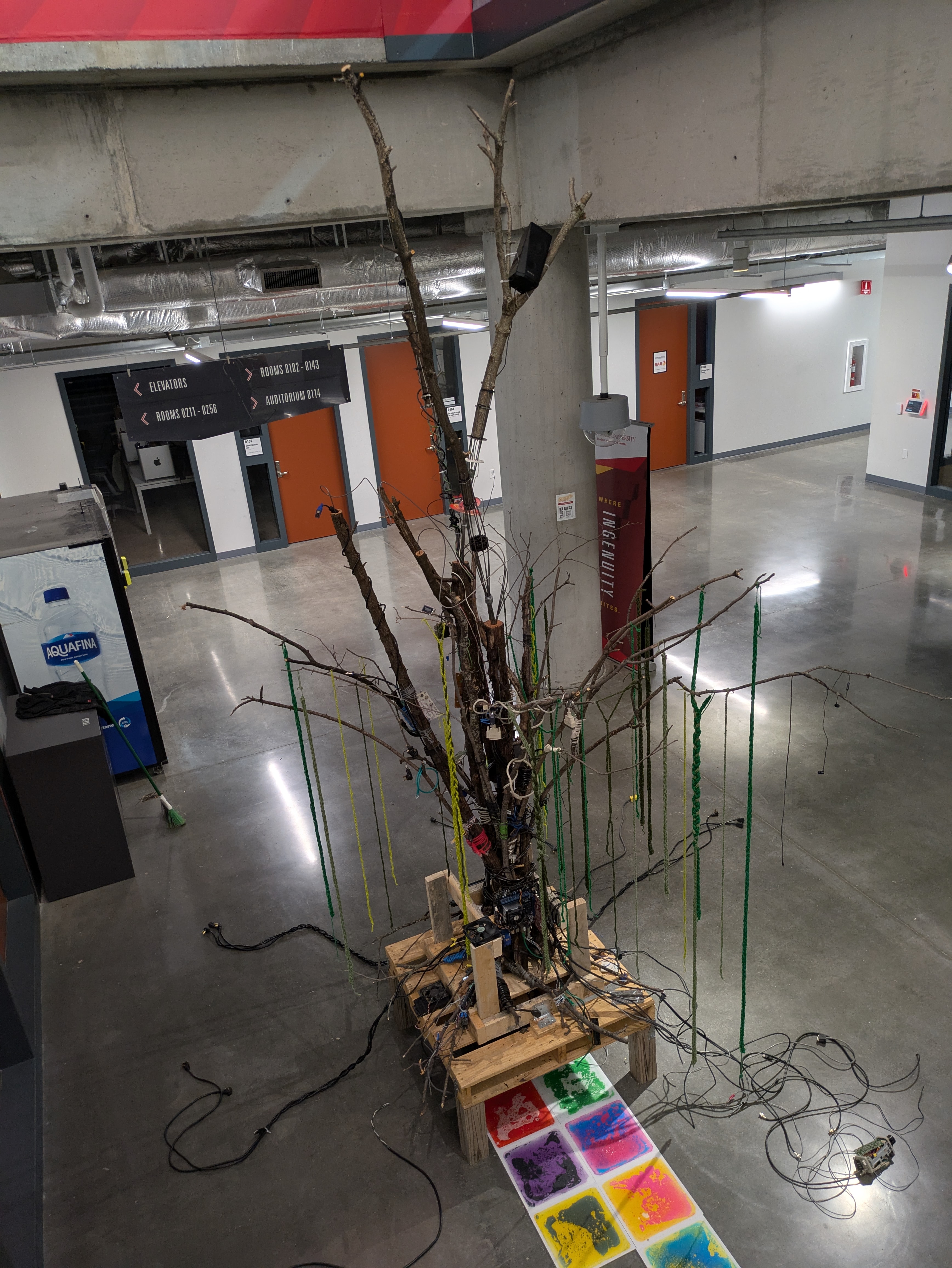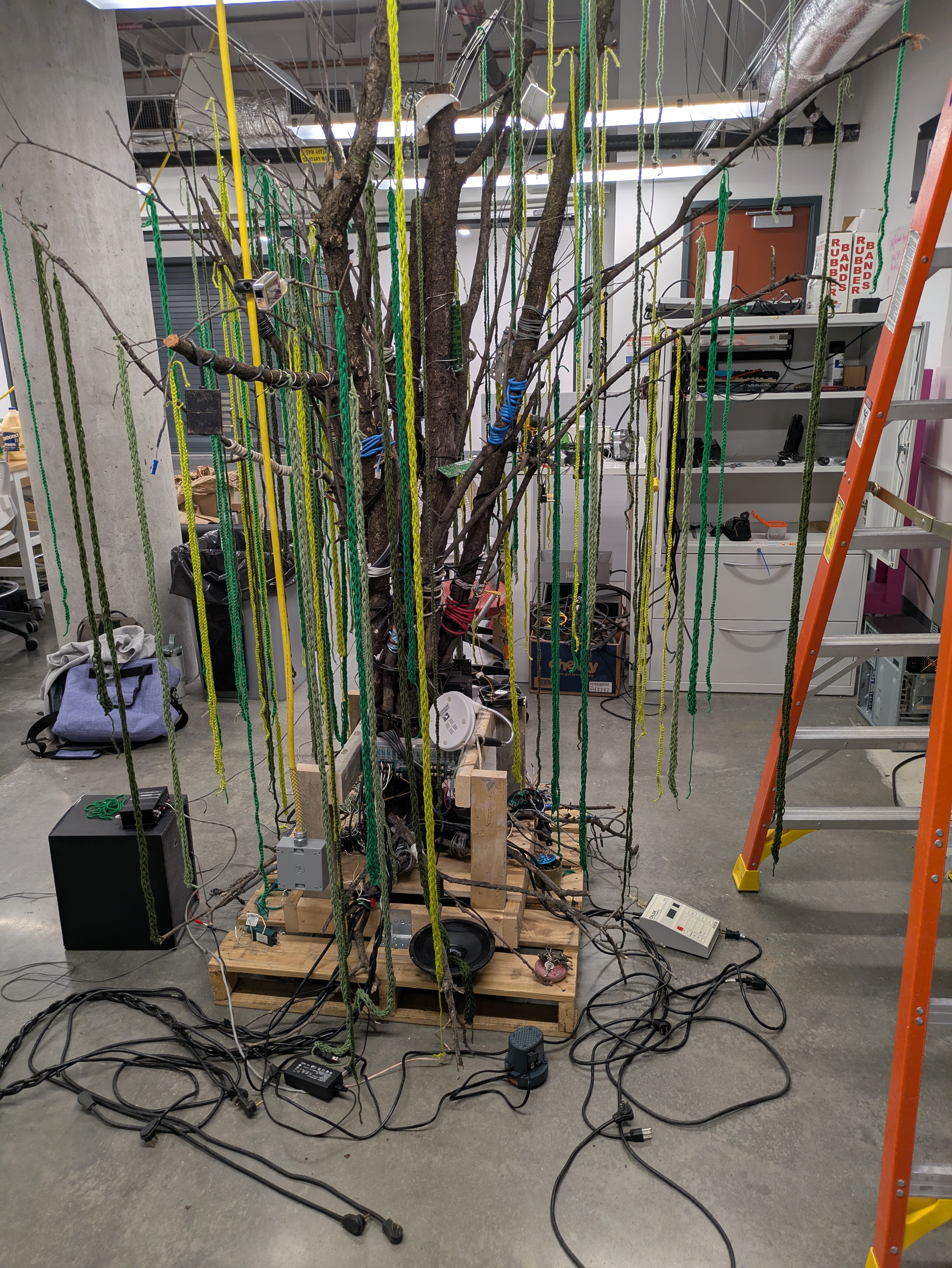 The entire structure was fabricated from recycled and found materials, using a dead tree as the primary framework. Technology included Raspberry Pi, a dedicated mini PC, custom sensor circuits, addressable LED strips, and a real-time audiovisual pipeline built with Processing, MIDI, and Strudel.js. Generative AI tools were used during early concept ideation and visual iteration.