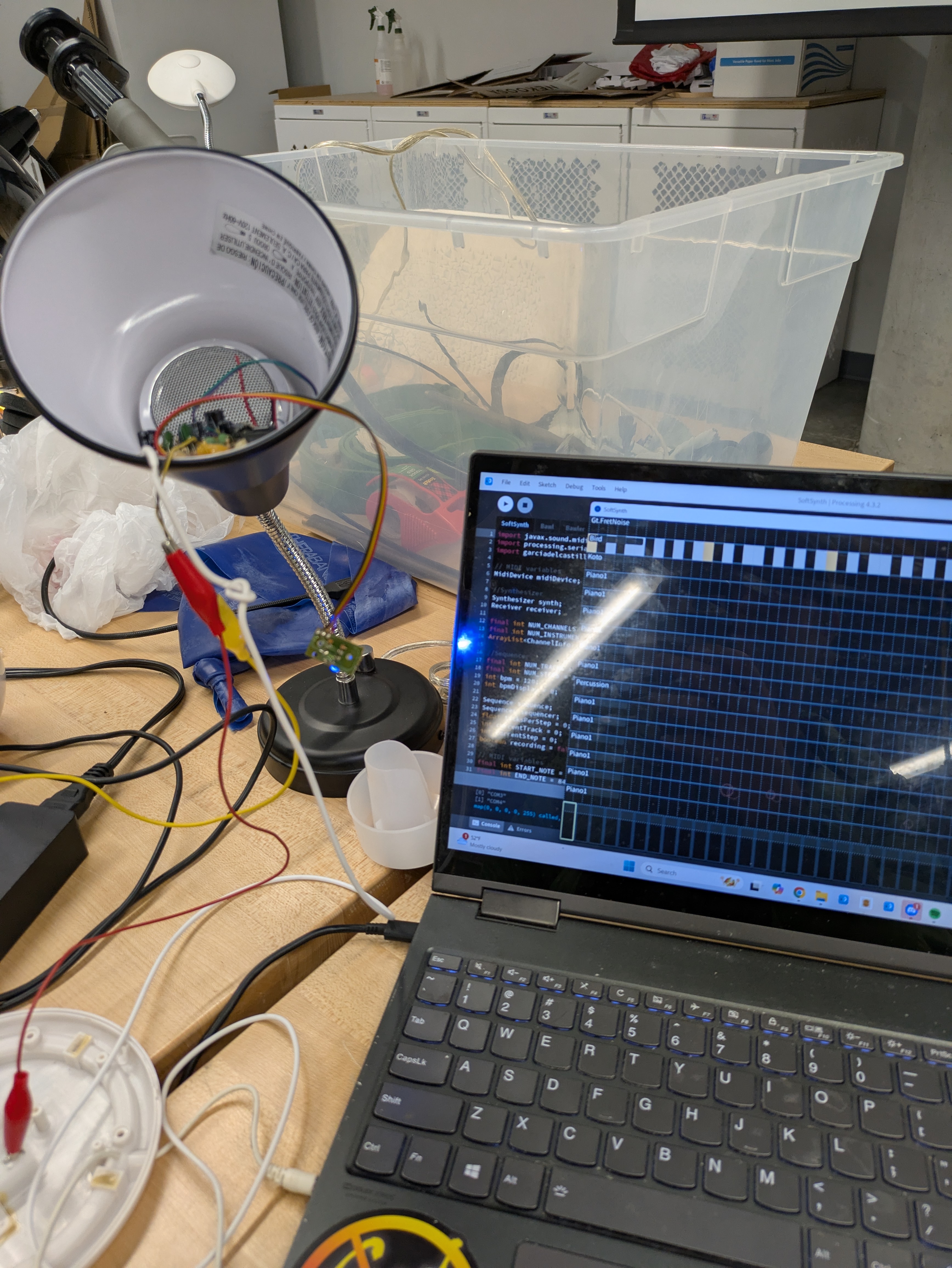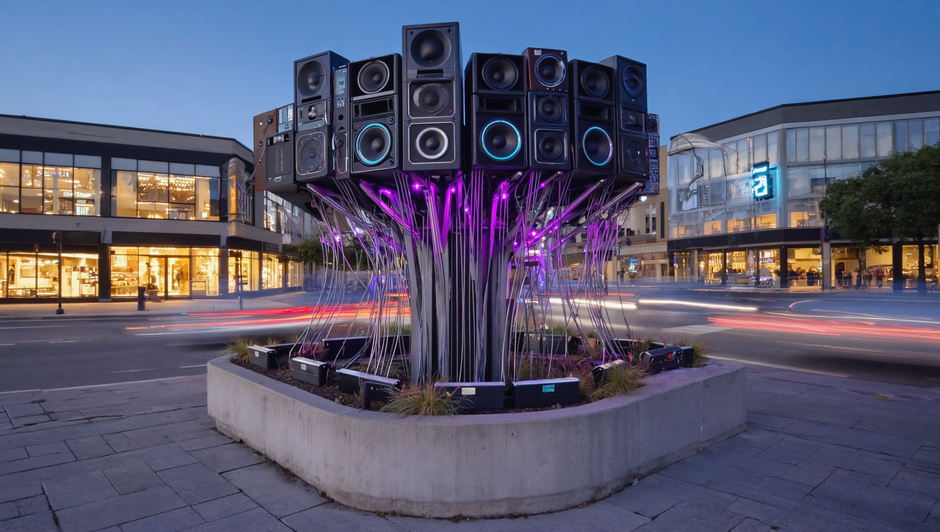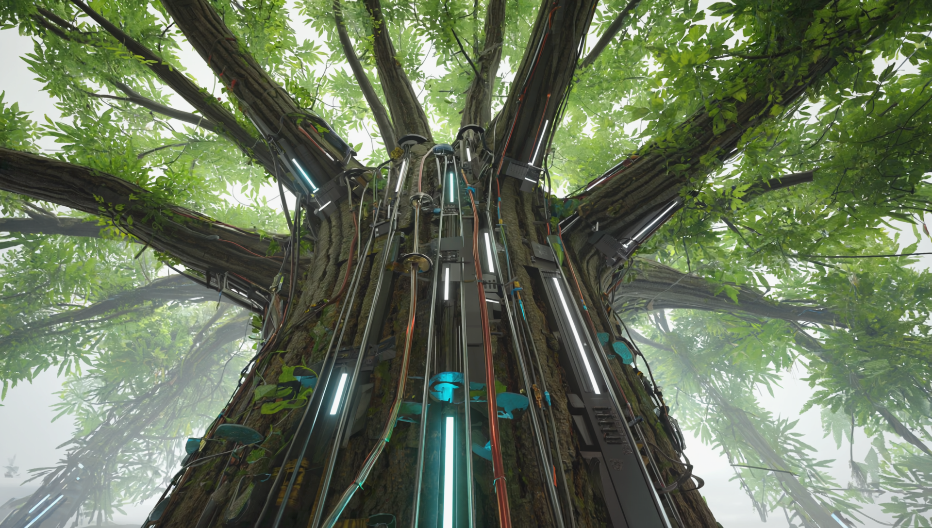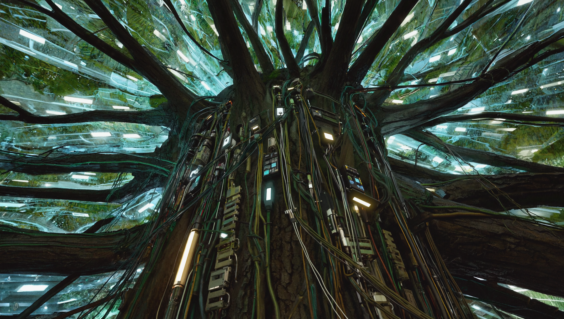 The entire structure was fabricated from recycled and found materials, using a dead tree as the primary framework. Technology included Raspberry Pi, a dedicated mini PC, custom sensor circuits, addressable LED strips, and a real-time audiovisual pipeline built with Processing, MIDI, and Strudel.js. Generative AI tools were used during early concept ideation and visual iteration.