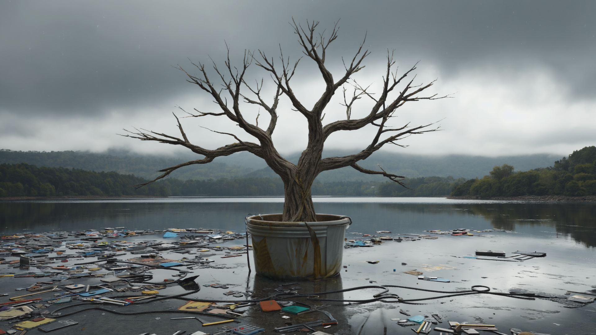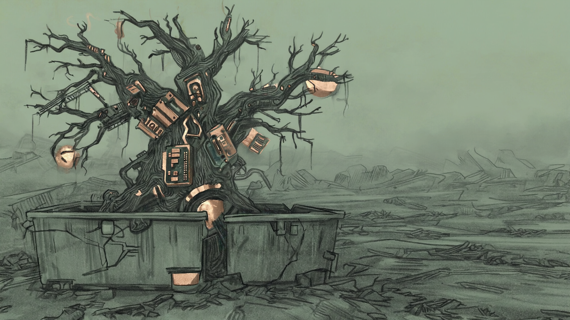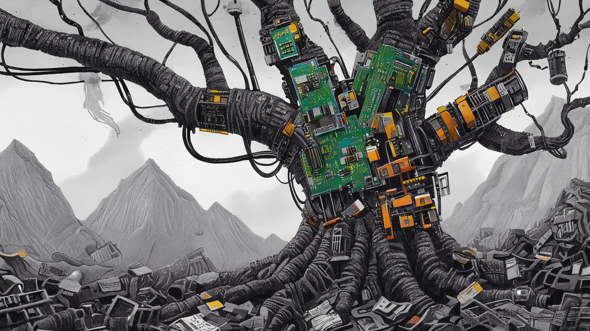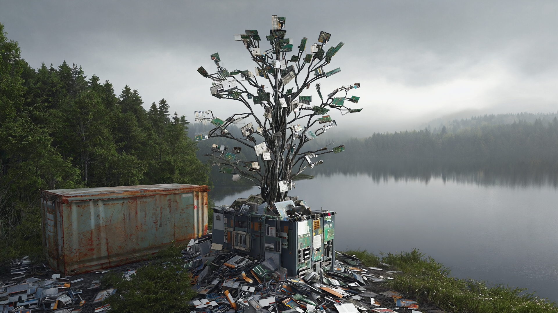 An interactive sound sculpture installation exploring themes of electronic waste, planned obsolescence, and environmental decay. The piece depicts a dead tree mutating with discarded electronics and post-consumer trash, emerging from a simulated landfill as a dystopian monument to overconsumption.
